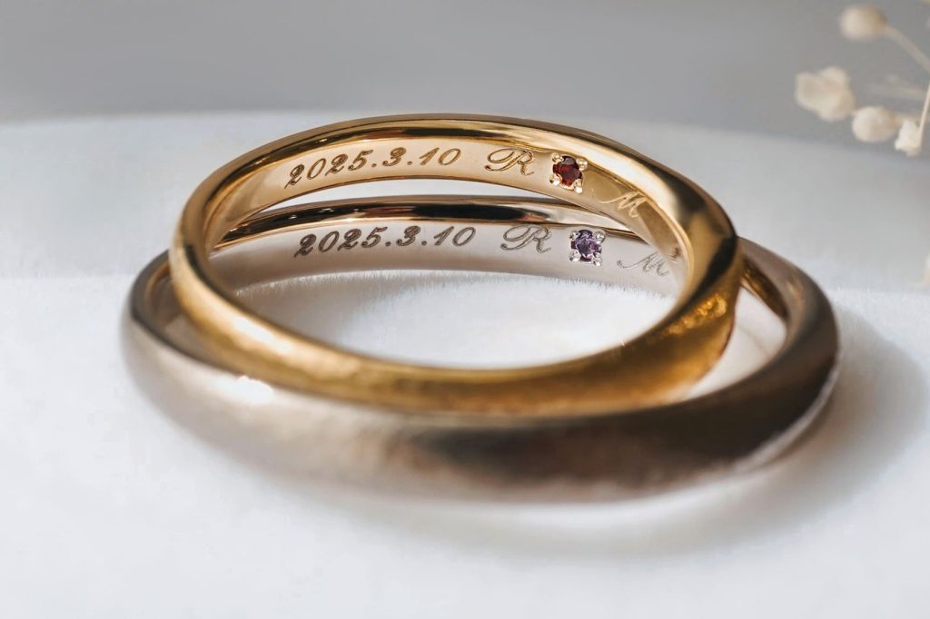 指輪の内側には、おふたりの記念日とイニシャルがレーザーにて刻印されています。