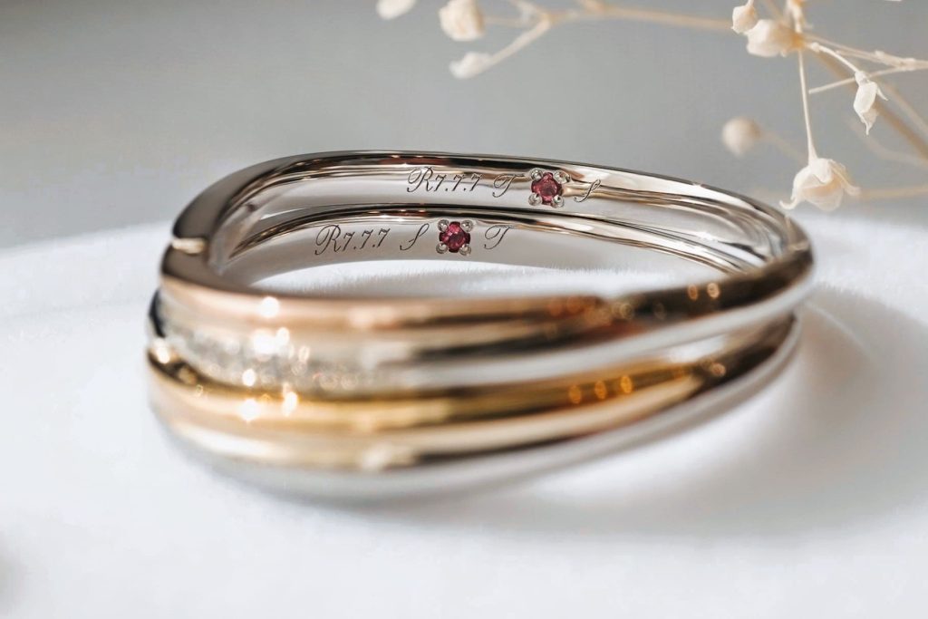 おふたりのイニシャルの間には、誕生石のピンクトルマリン(10月)が留められています。