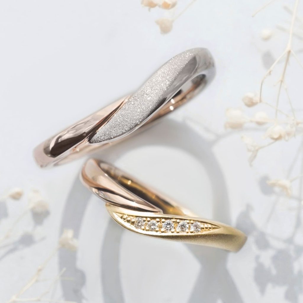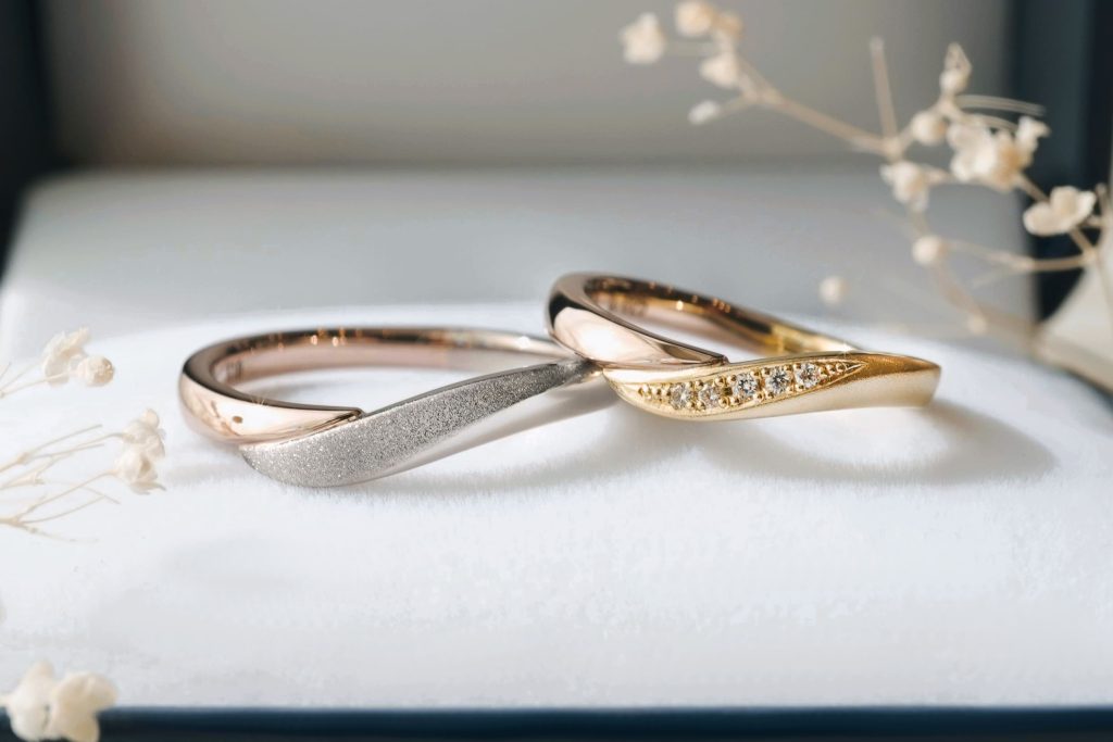 異素材を組み合わせたV字デザインの結婚指輪をオーダーいただきましたのでご紹介いたします。