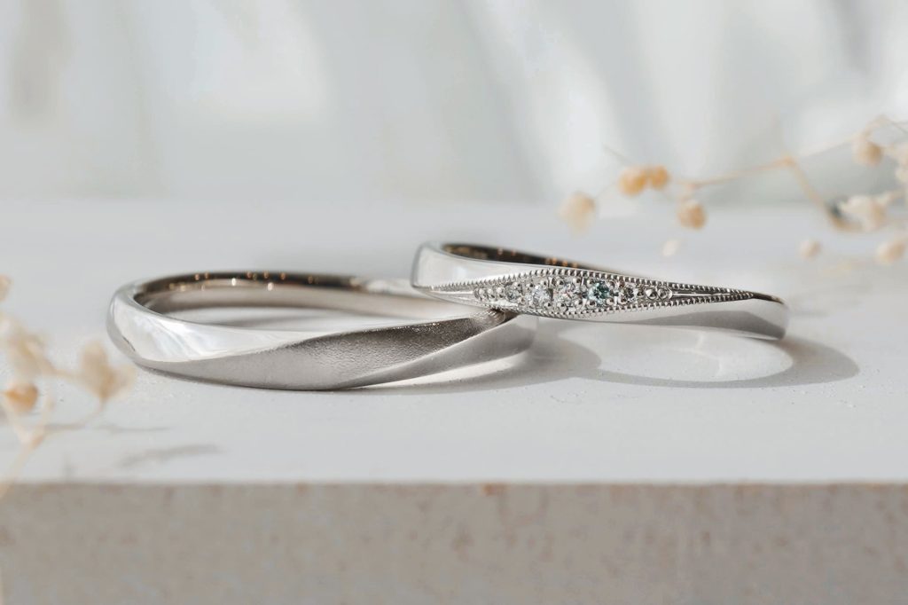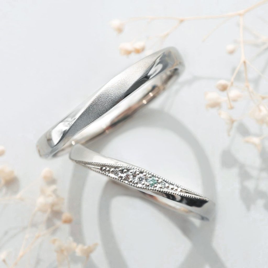 シンプルの中にも、表面加工やミルグレイン、ダイヤでアレンジを加え、上品な輝きを持つ素敵な指輪が出来上がりました。