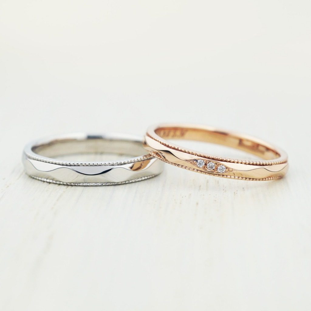 旦那様はプラチナ素材、奥様はK18ピンクゴールドを使用しています。