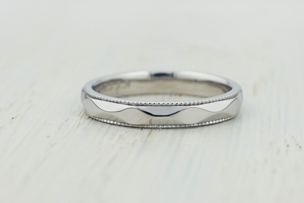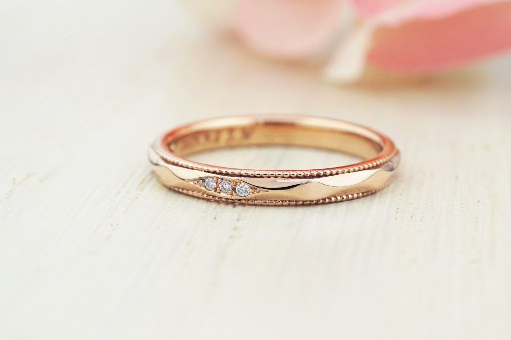 奥様のリングには一部ひし形模様のところにダイヤモンドを3石入れ、華やかに。