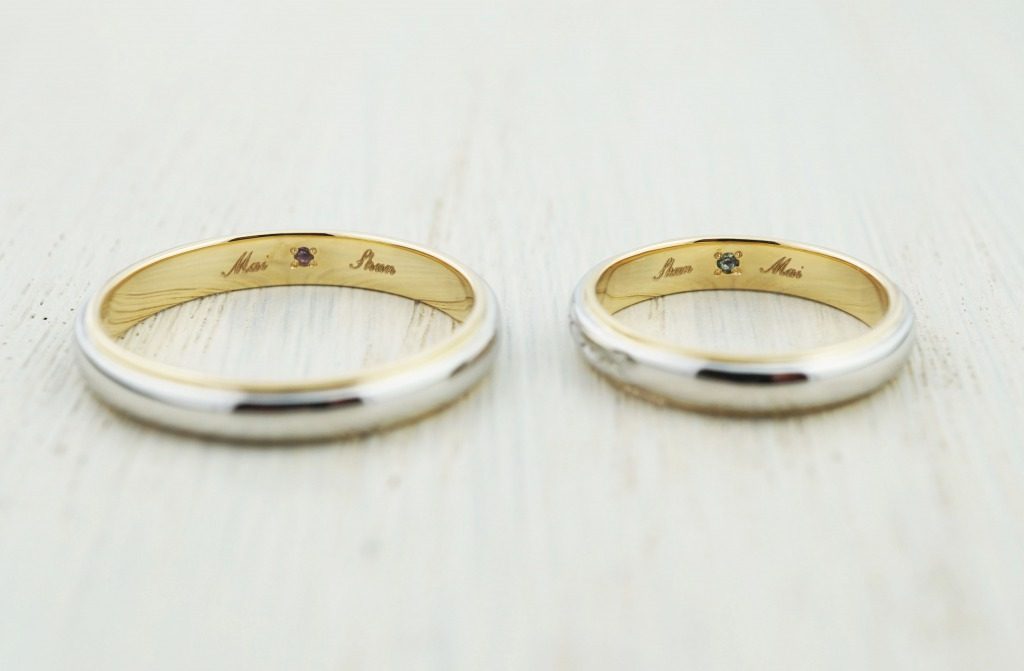 内側には誕生石(アメジスト・アクアマリン)を留め、両側にはお互いの名前を刻んでいます。