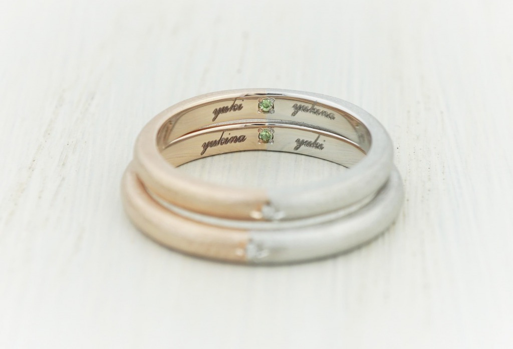 内側にはおふたりの名前と誕生石のペリドットを留めさせていただきました。