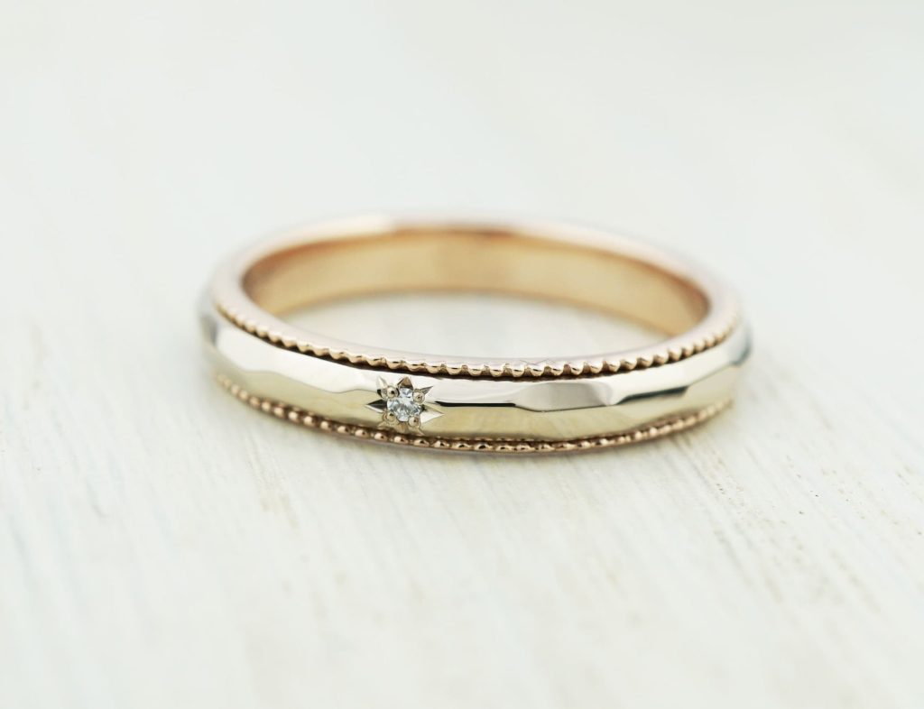 上下のミルグレインと内側の部分がピンクゴールドです。それぞれの素材が上品に輝きます。