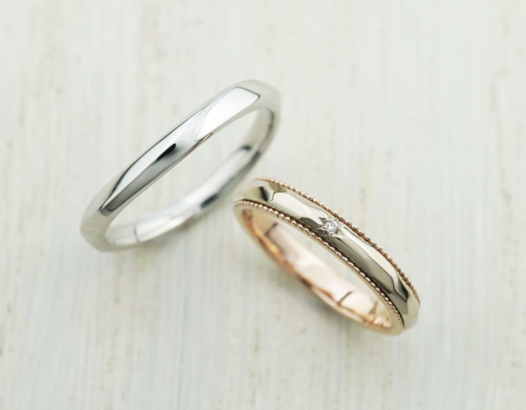 旦那様のデザインはPT900素材のフリュ。奥様のデザイン素材はK18シャンパンゴールドとピンクゴールドのコンビネーション、ノア。