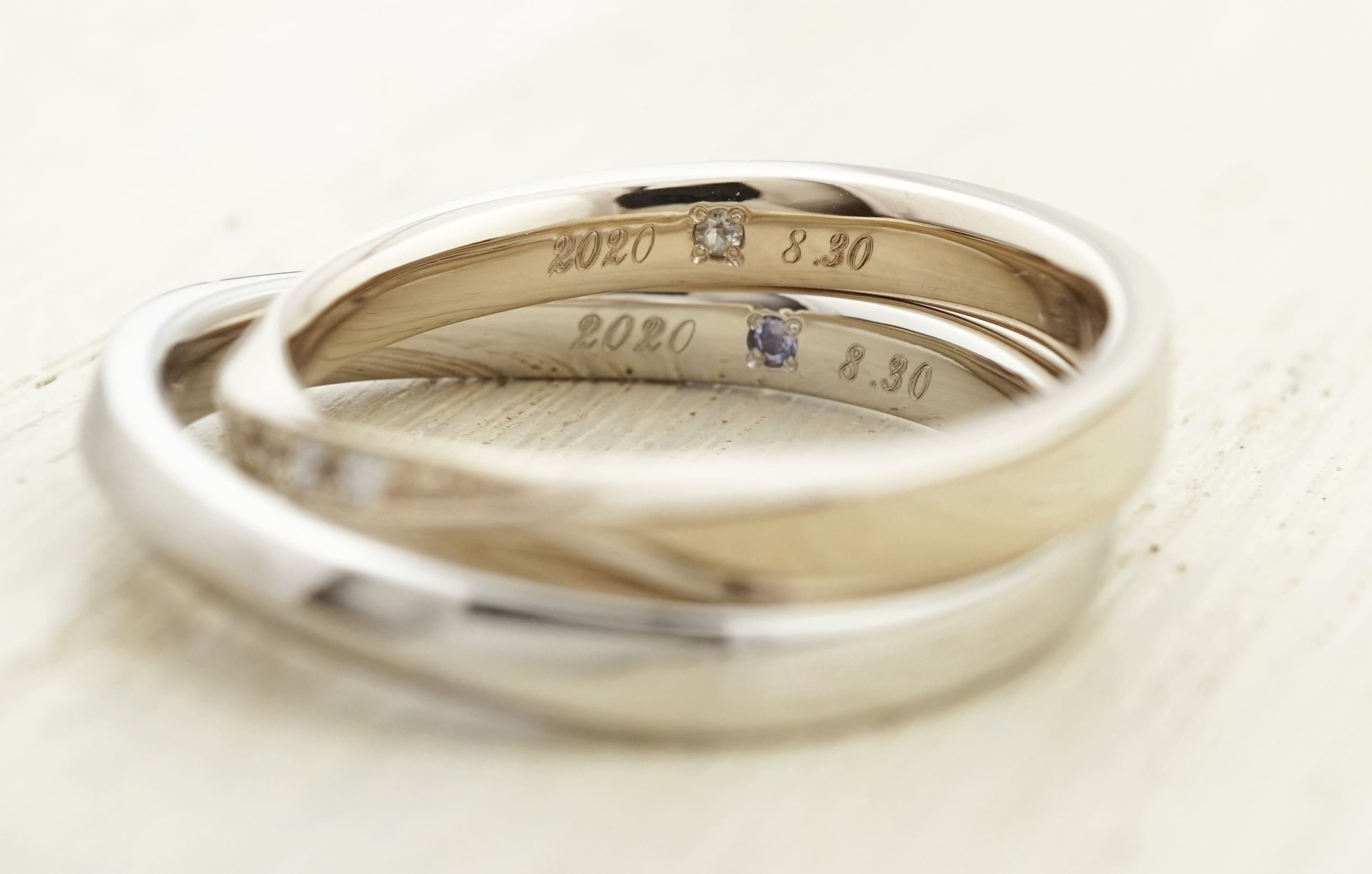 内側には記念日と誕生石(ダイヤモンドとタンザナイト)を留めています。