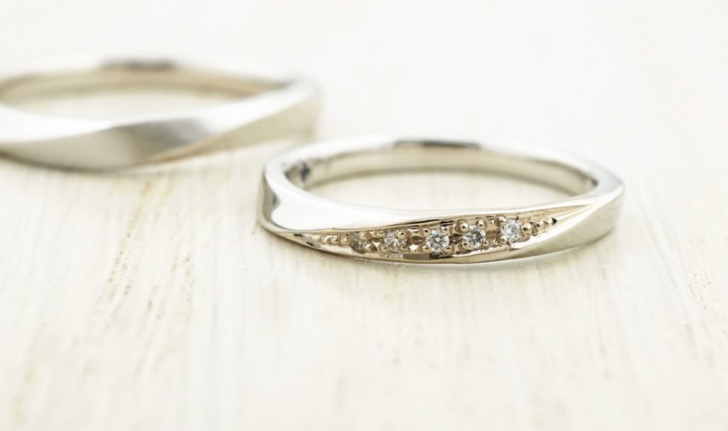 ダイヤが留まるラインに色を加えた結婚指輪