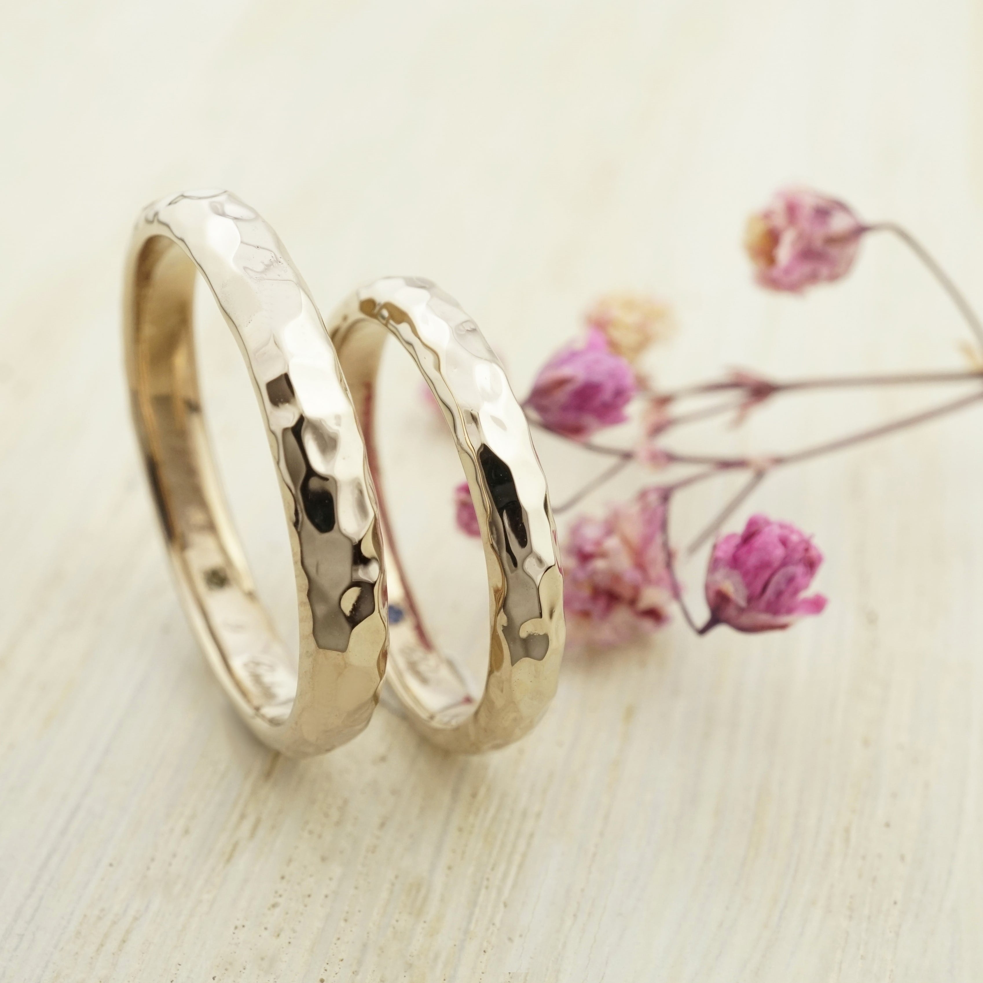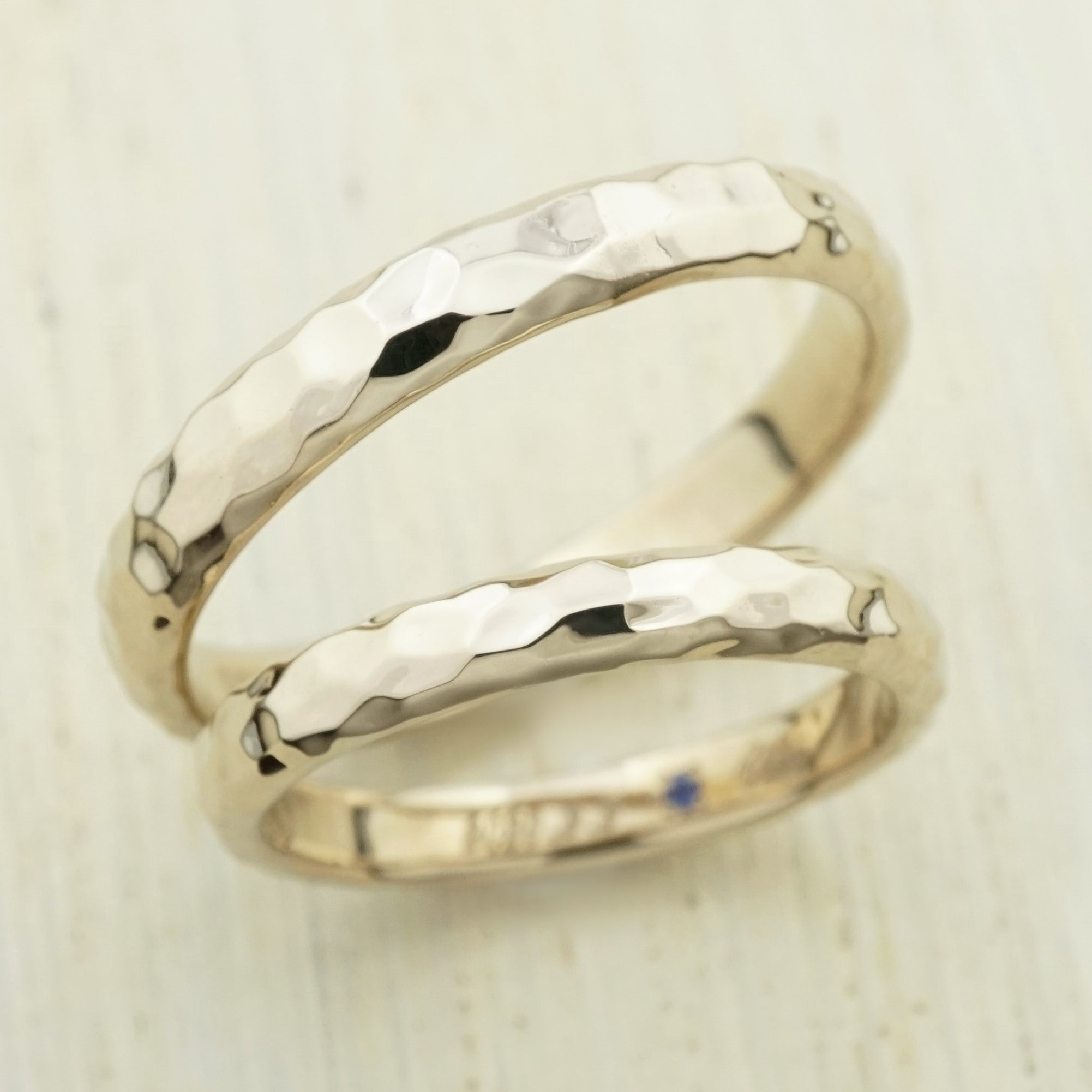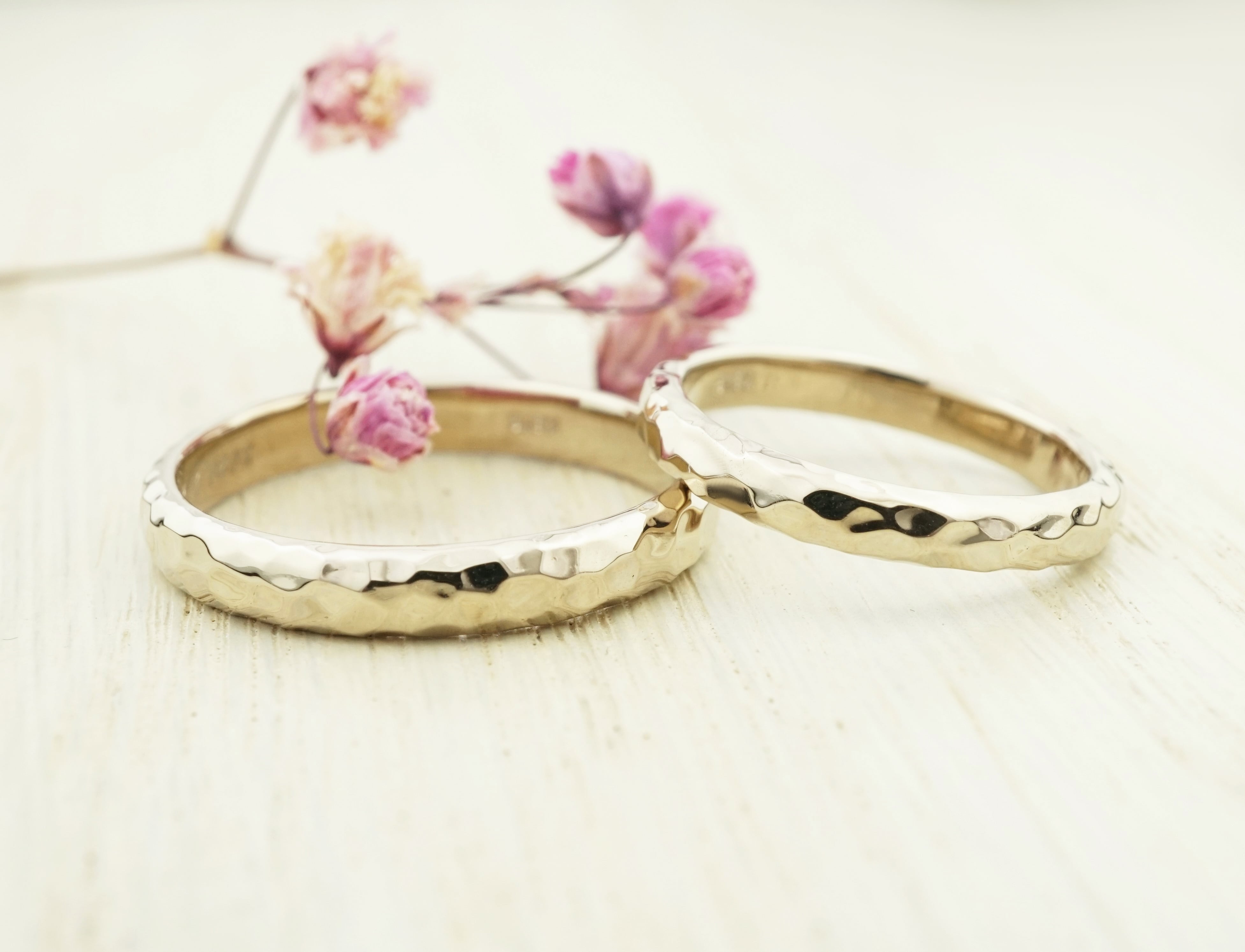 どの方向にも輝きを放つのは、指輪表面全体に鎚目加工を施しているからです。