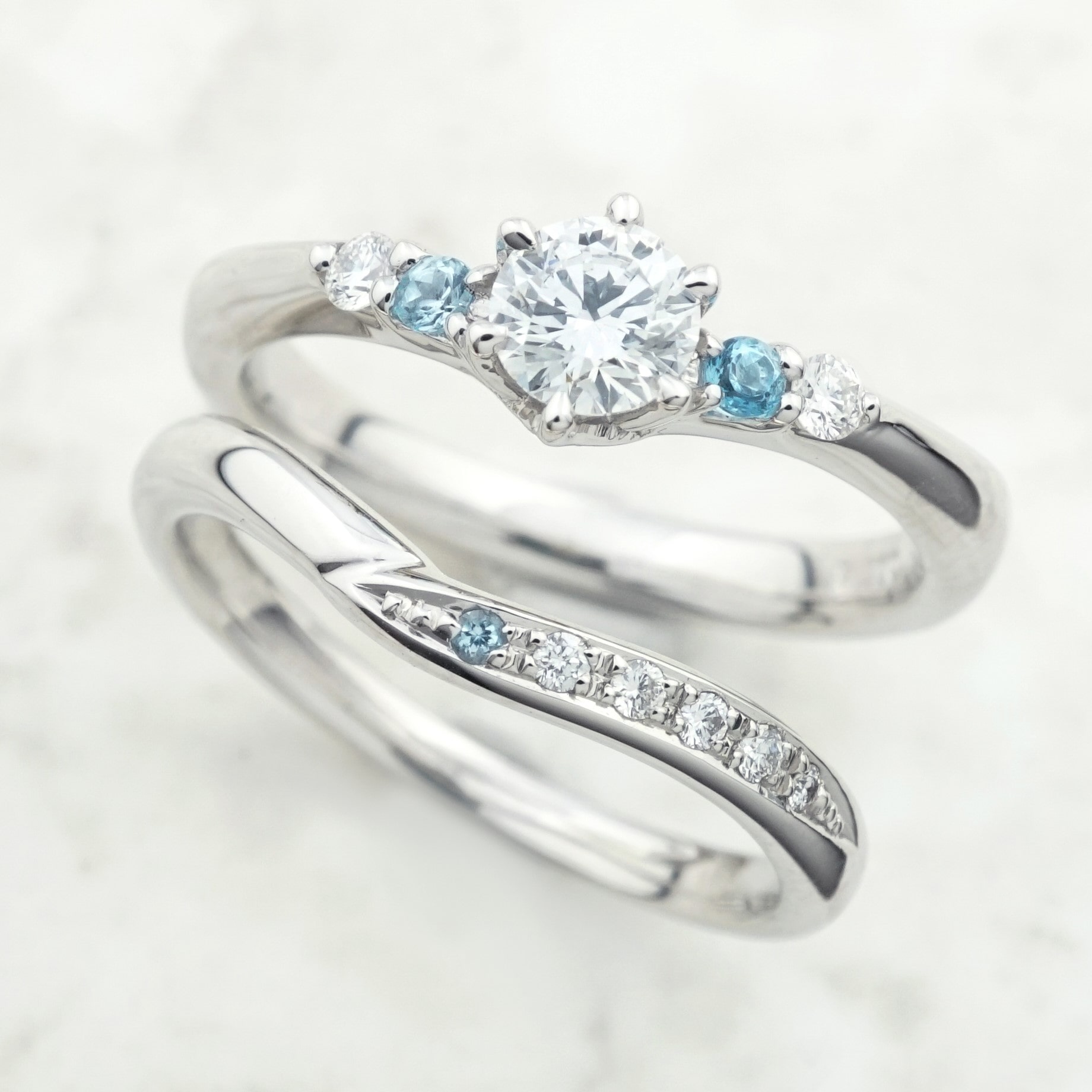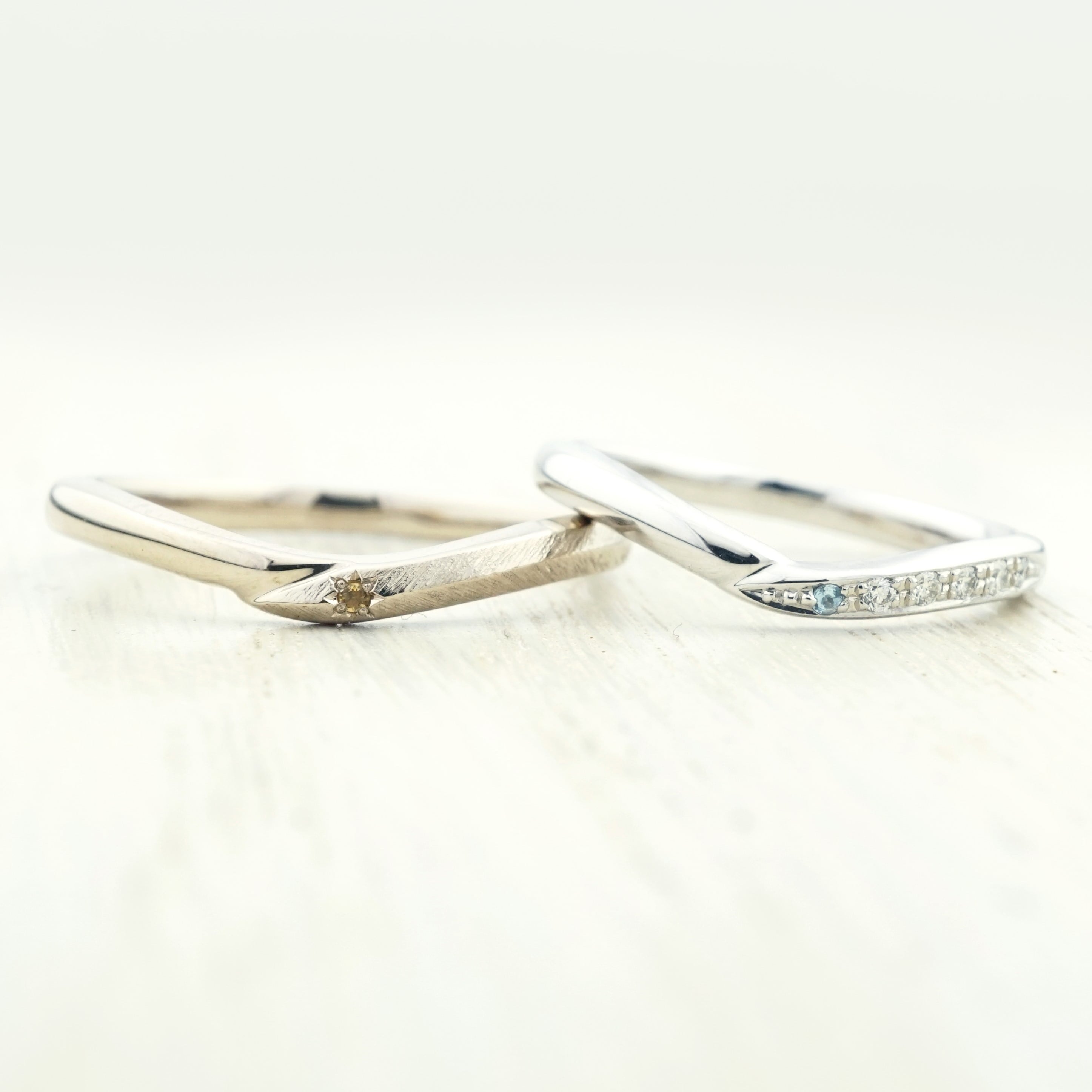 旦那様の誕生石はイエロートパーズ、奥様はダイヤモンドと組み合わせブルートパーズを留めています。