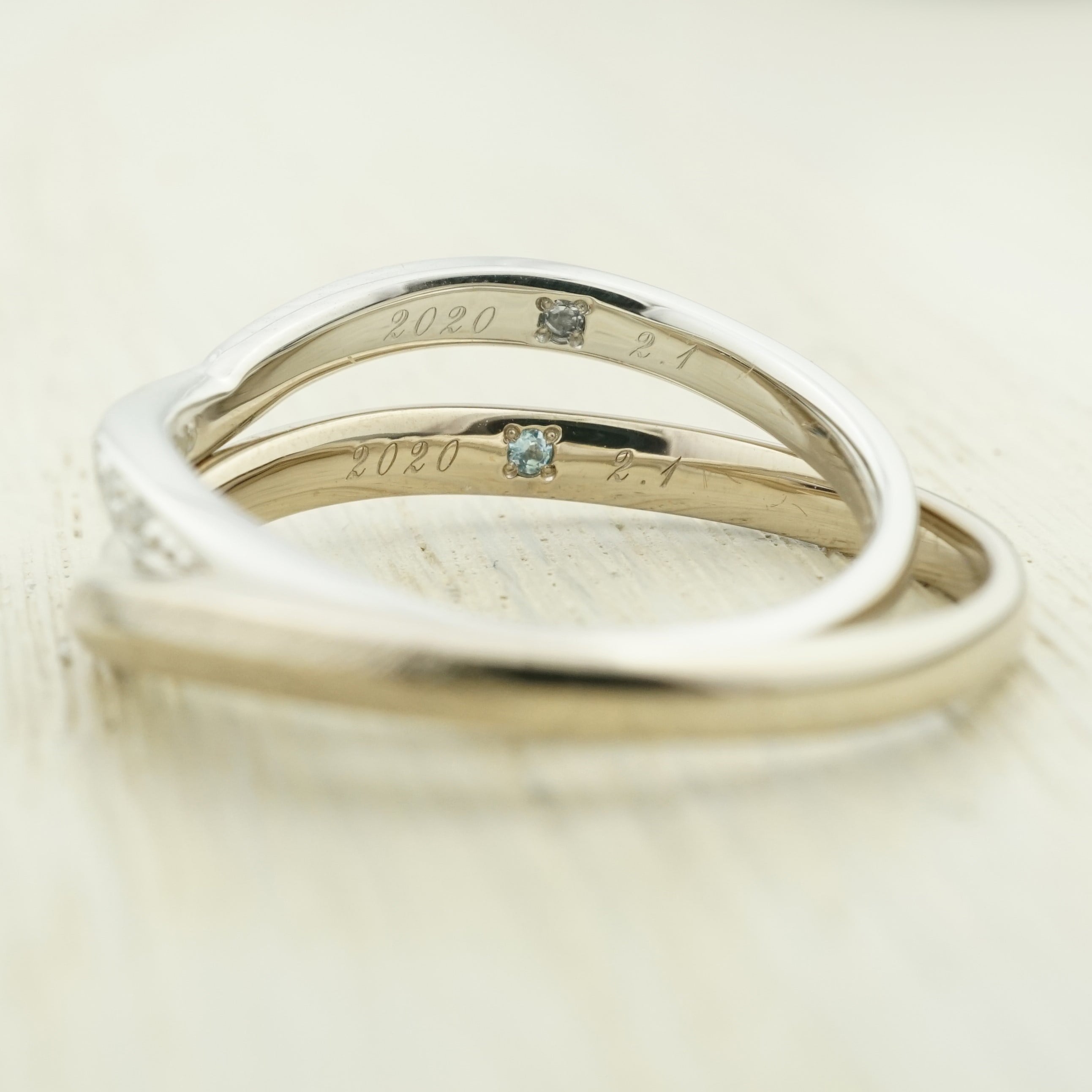 内側にはレーザー加工で記念日を刻印し、お互いの誕生石を留めています。