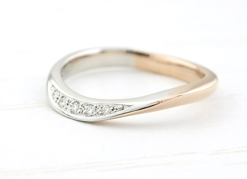 奥様のリングは、片面ひねりに沿ってホワイトダイヤモンドを5石留めています。
