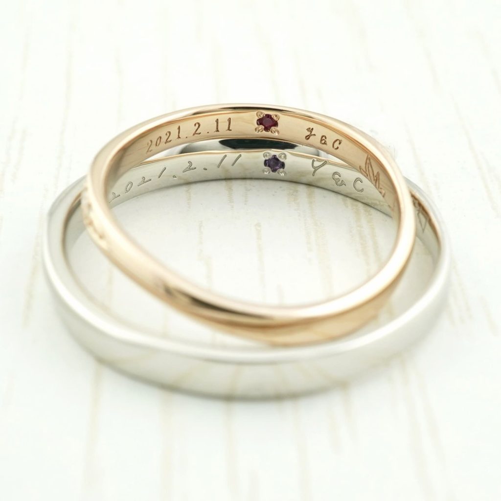 指輪同士が重なったら浮かび上がる、手書きモチーフと日付・イニシャルもオリジナルのポイントです。
