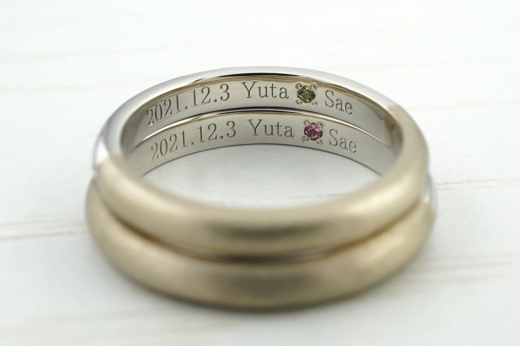 指輪の内側にはおふたりのお名前と記念日が刻印されています。