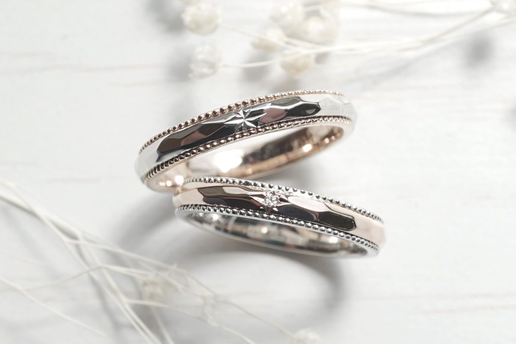 指輪の上下にはミルグレイン加工、表面には柔らかな槌目加工を施しています。またメンズリングには星彫り、レディースリングにはダイヤモンドを星留めしています。
