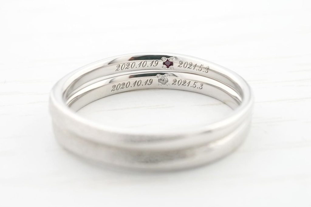 指輪の内側には、結婚記念日と誕生日をレーザーで刻印。さらに誕生石を留めてあります。