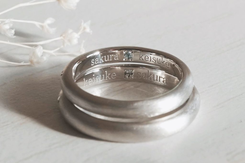 内側にはお互いの名前とブルートパーズ、ダイヤモンドを留めています。
