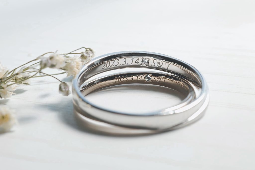 指輪の内側には記念日とおふたりのイニシャルをレーザーにて刻印し、記念日、イニシャルの間にはお互いの誕生石を留めています。