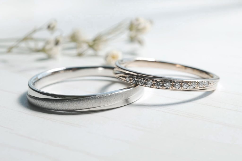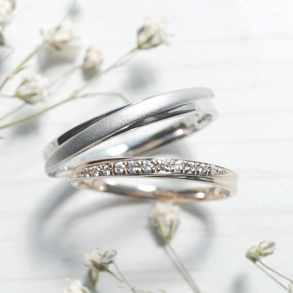 ライン部分に旦那様はホーニングのつや消し加工を、奥様はダイヤを11石留めています。