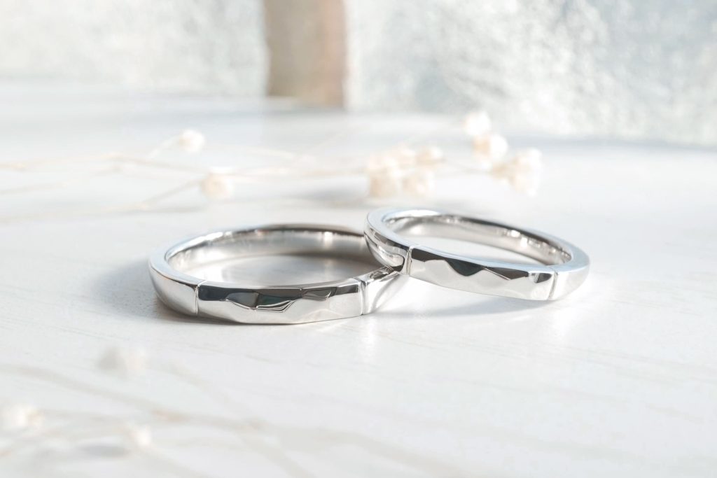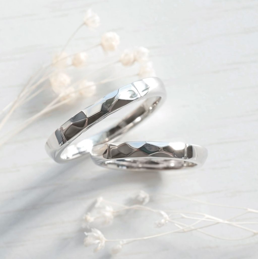 トップに断面槌目模様を施したオーダーメイドの指輪を、おふたりともPt900素材でご注文いただきました。