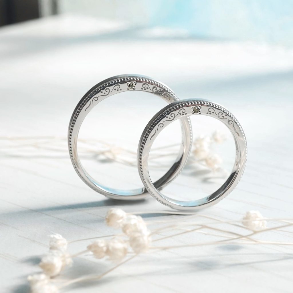 表面はシンプル、サイドが鈴蘭モチーフのLiLi/リリーをおふたりともPt900素材でオーダー頂きました。