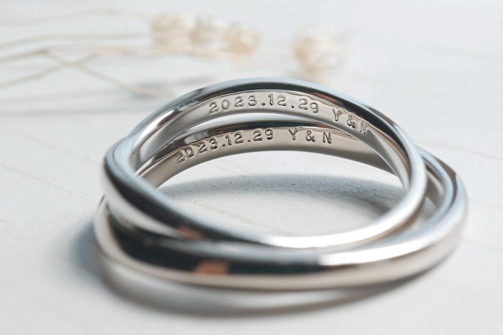 指輪の内側はレーザー、打刻と刻印種類がある中で温もりを感じられると打刻をお選びいただき、おふたりの記念日、イニシャルが刻印されています。