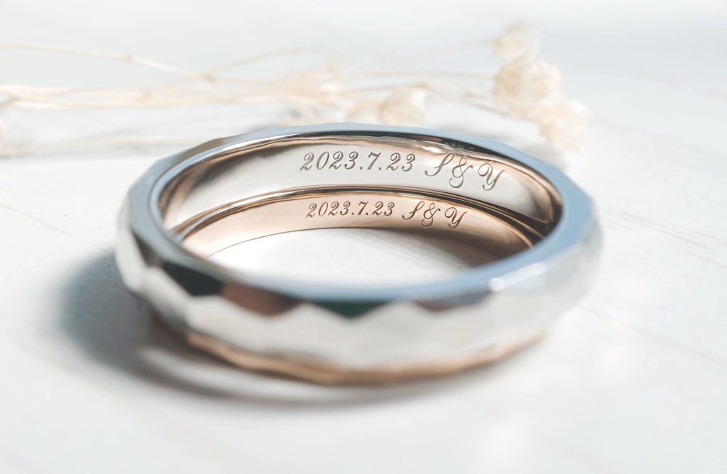 指輪の内側には、おふたりの記念日とイニシャルがレーザーにて刻まれています。