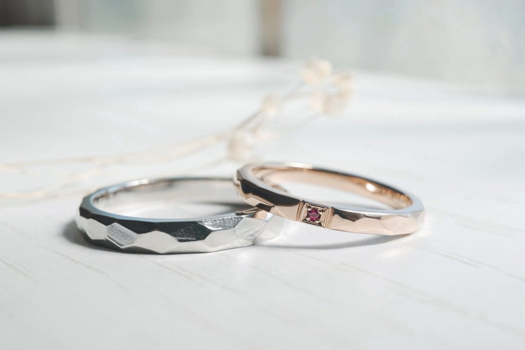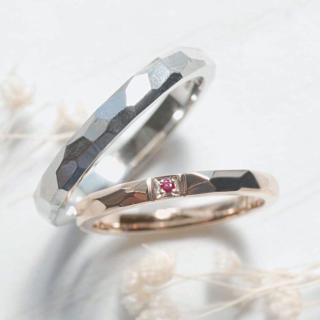 メンズリングはPt900、レディースリングはK18ピンクゴールドをお選びいただき、槌目模様が特徴的な結婚指輪をオーダーメイドで注文いただきました。