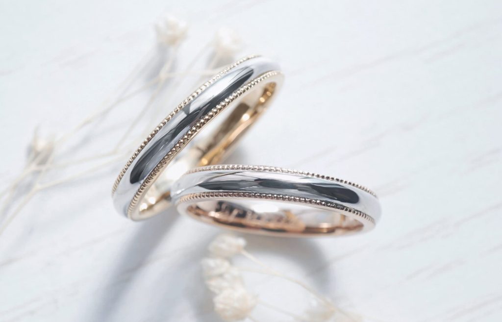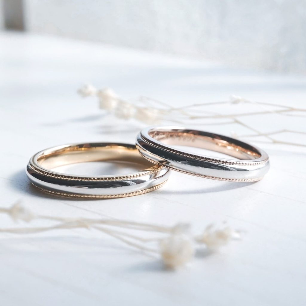 ミルグレインの素材をお好みで変えた結婚指輪をオーダーいただきましたのでご紹介いたします。