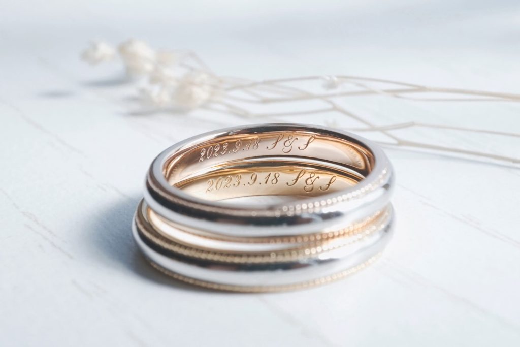 指輪の内側には、おふたりのイニシャルと記念日がレーザーにて刻まれています。