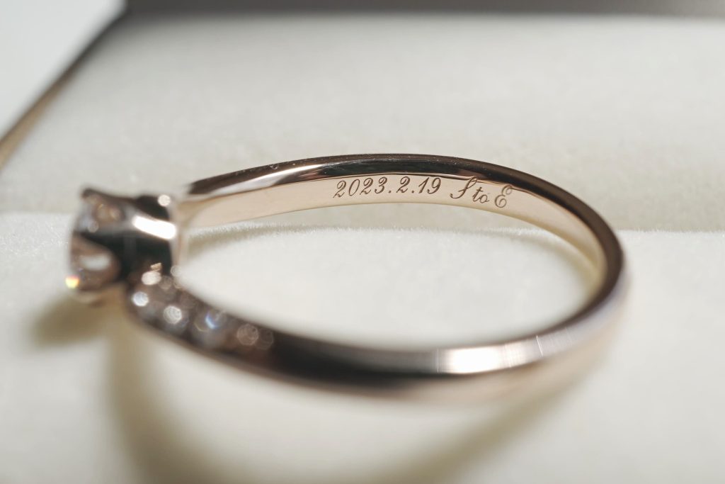 指輪の内側には記念日とイニシャルがレーザー筆記体にて刻印されています。
