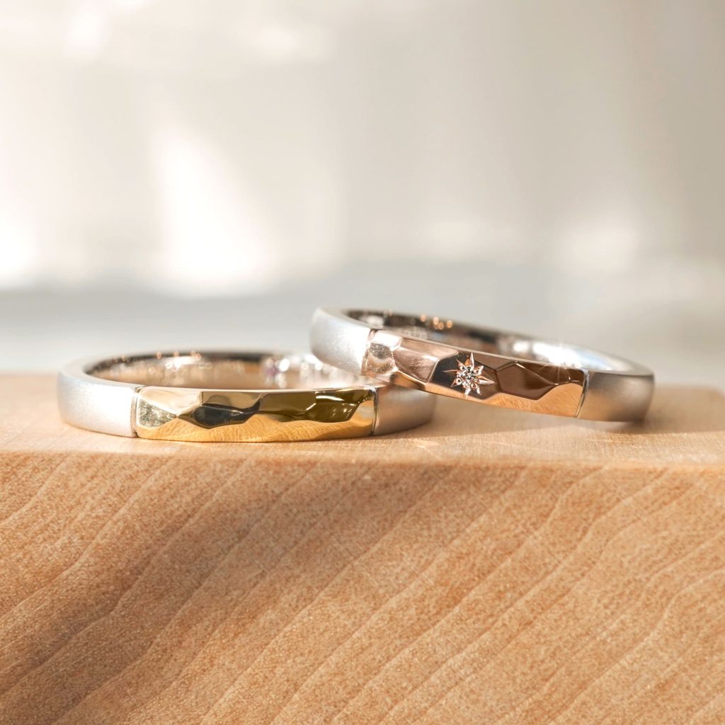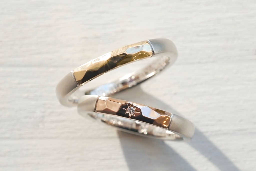 槌目模様部分はメンズリングがイエローゴールド、レディースリングはピンクゴールド素材をお選び頂き光沢で仕上げています。