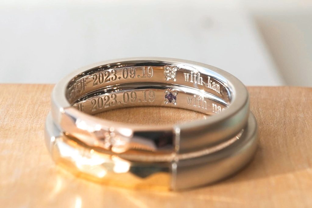 内側はおふたりの苗字、記念日お名前をレーザー刻印で刻み文字の間にはおふたりの誕生石ダイヤモンドとアメジストを留めてあります。