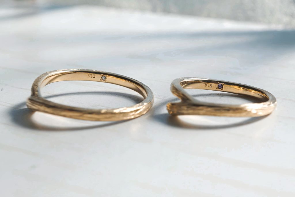 どちらもK18イエローゴールド素材をお選びいただき、表面は木目模様の筋を入れて仕上げています。