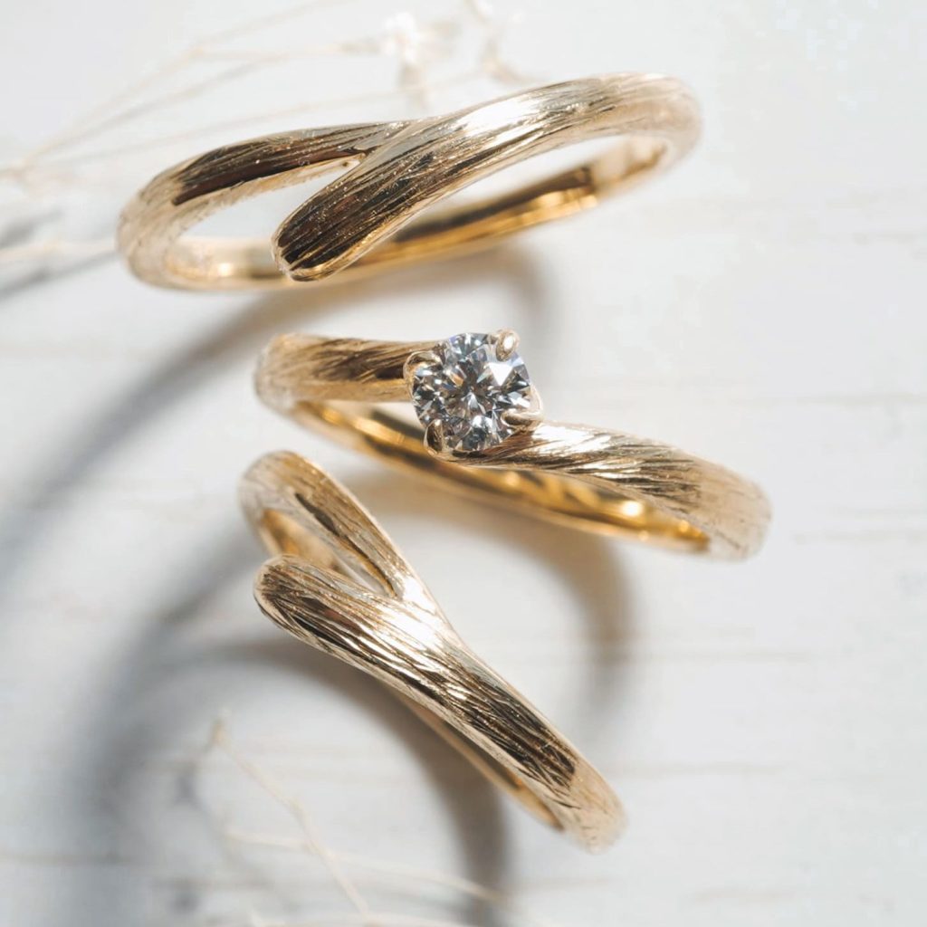 結婚指輪と同じ木目模様の筋を入れて統一感ある重ね付けも楽しめるセットリングに仕上がりました。