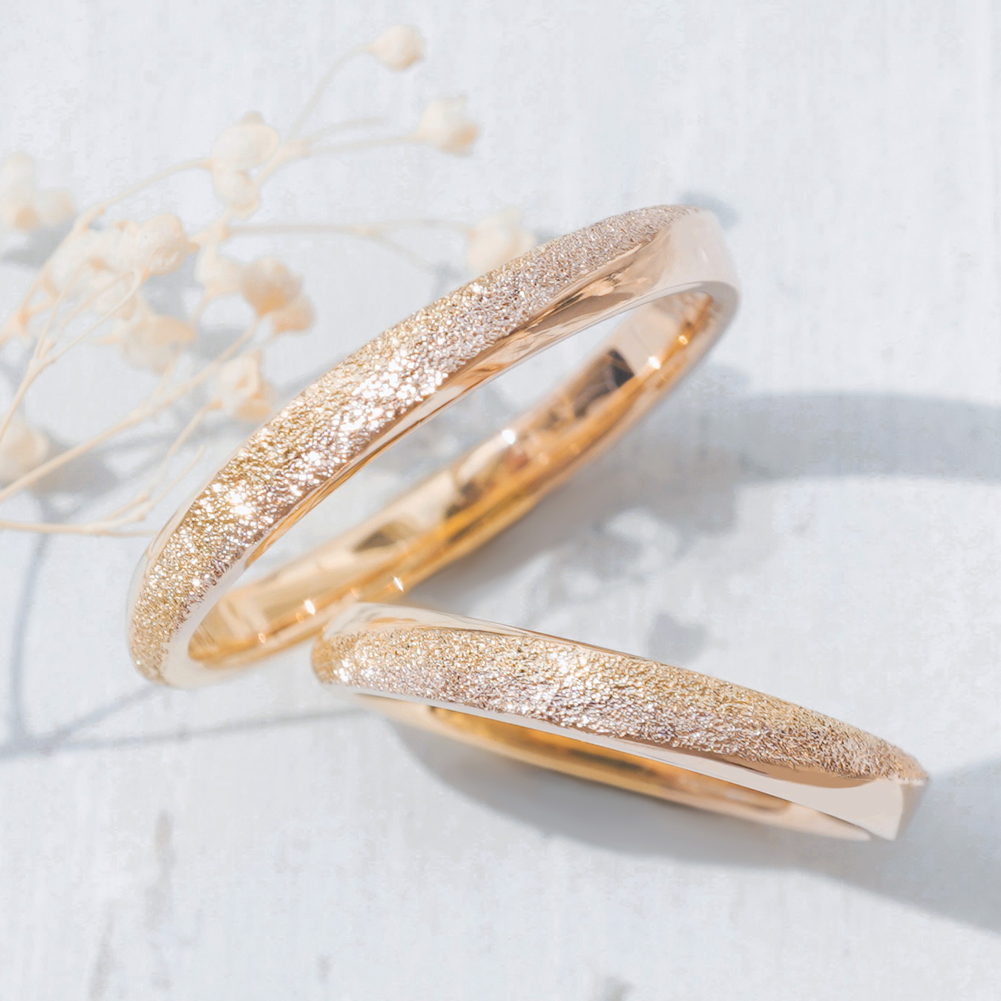 明るい色味でスターダスト加工が輝く、煌びやかな印象の結婚指輪に仕上がりました。