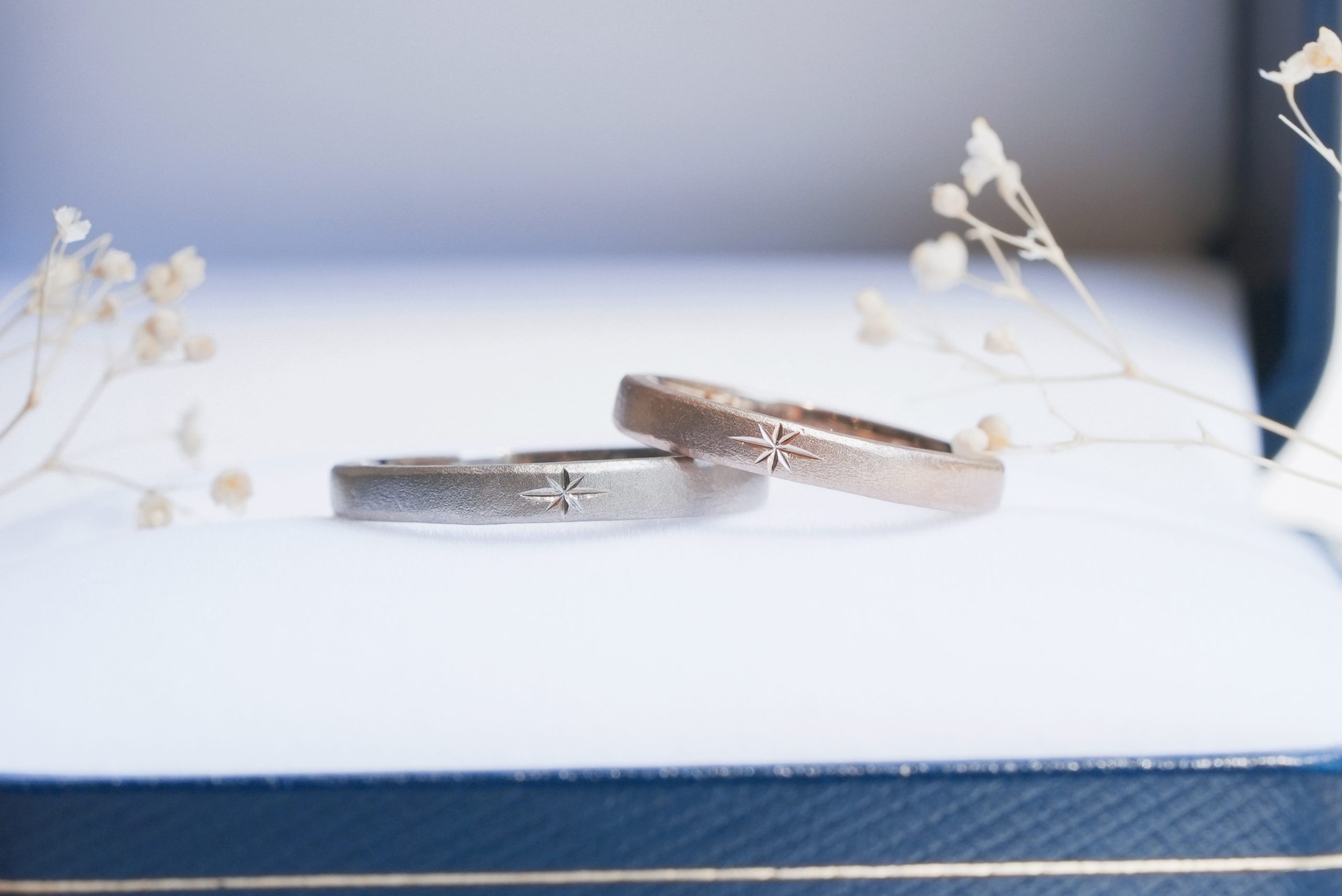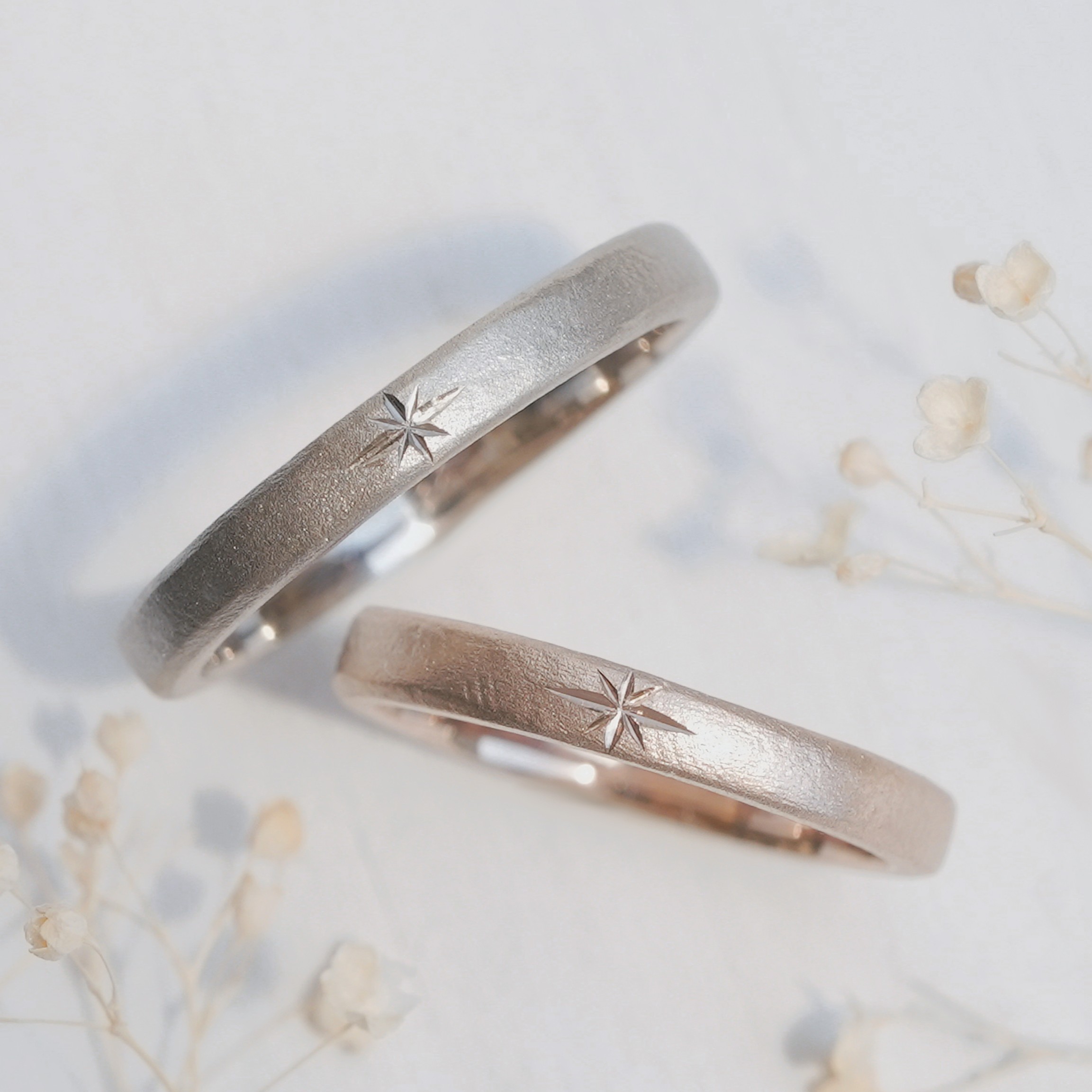 お揃いの星彫りを施した結婚指輪をオーダーいただきましたのでご紹介いたします。