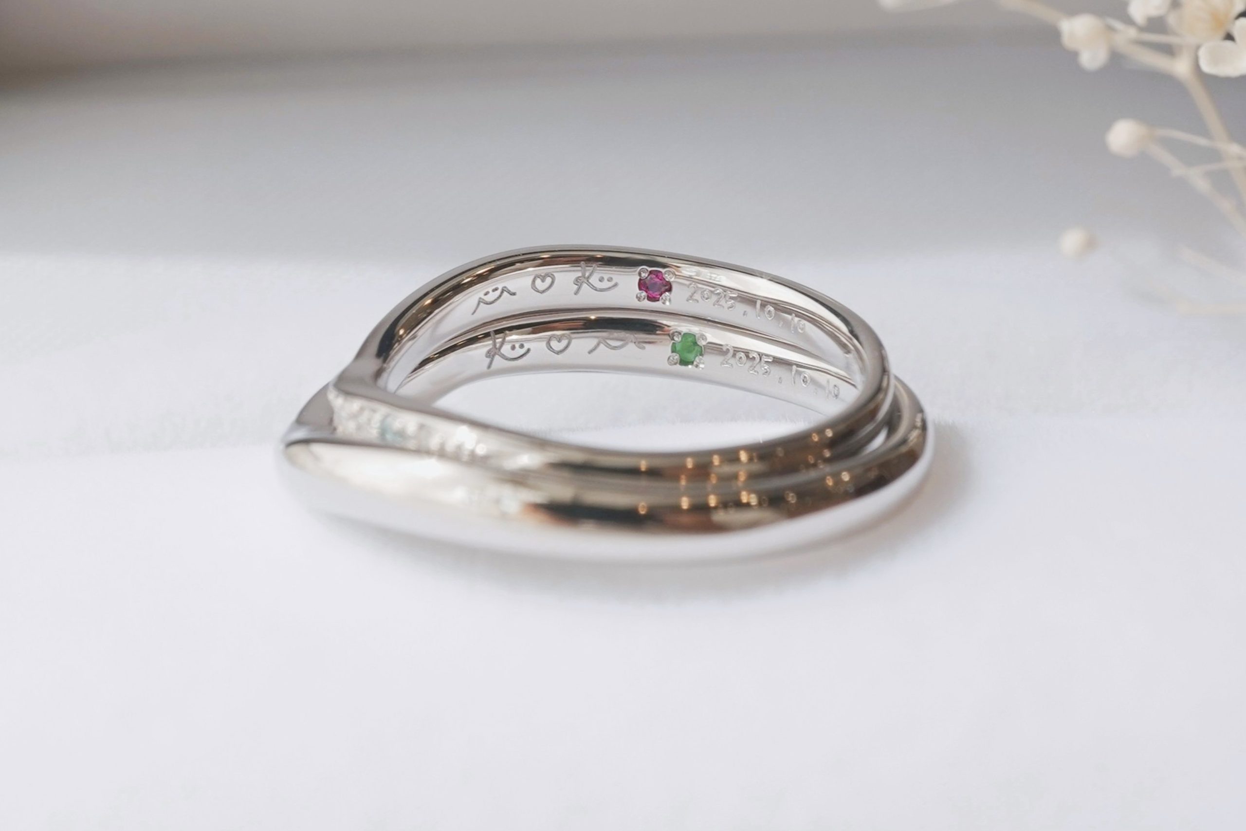 手書きイラストと記念日の間にそれぞれの誕生石を留め、可愛らしく仕上がりました。