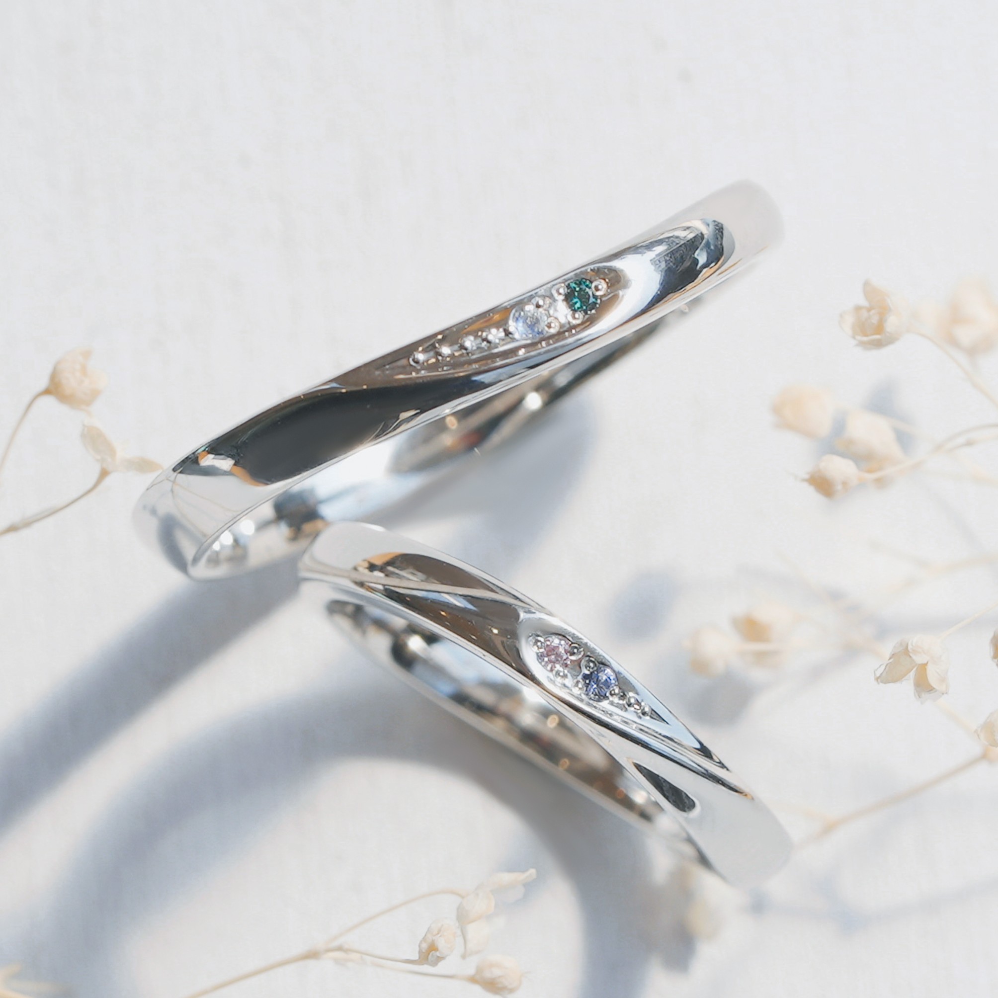 素材と加工はお揃いにして、ダイヤと誕生石のお色味で個性を出した指輪に仕上がりました。