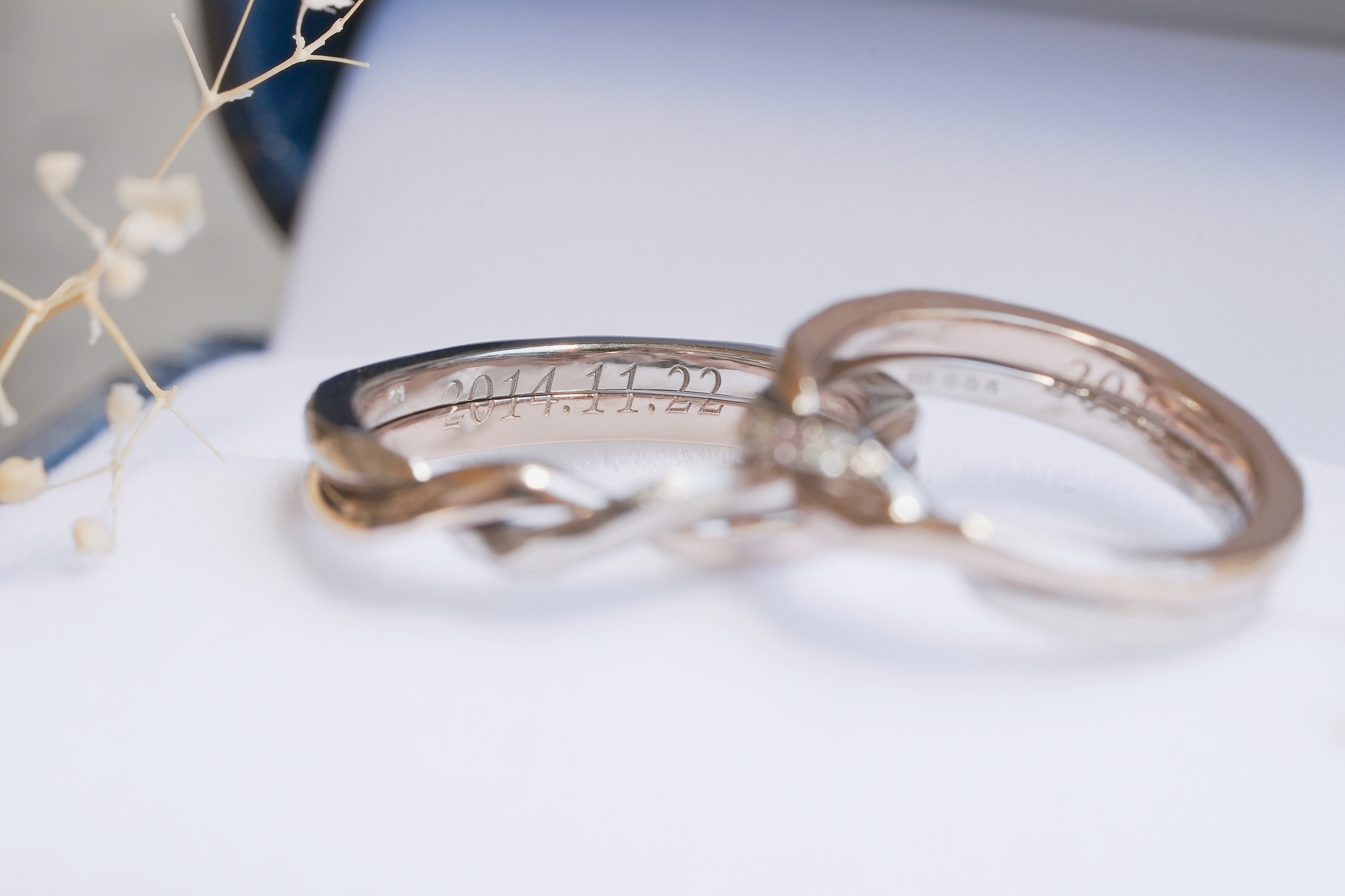 内文字には、おふたりの記念日が2つのリングにまたがるようにレーザーにて刻印されています。